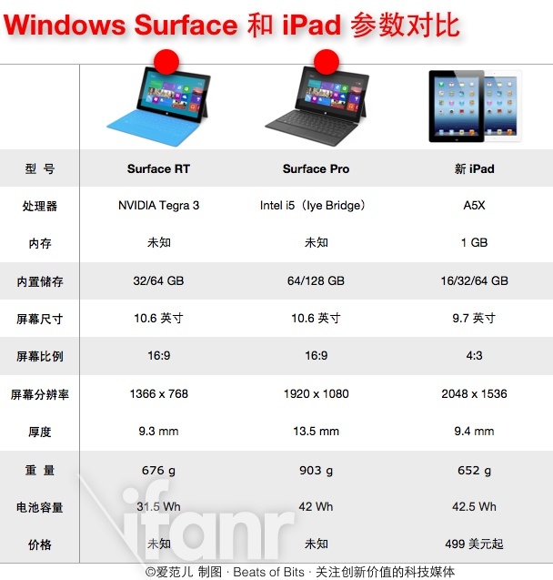 眼下距离 Surface 平板正式上市还有一段时间,在真正接触设备之前,我们不妨利用已公布的硬件参数来比较一下 Surface 平板和 iPad 的差异。主要规格如下: