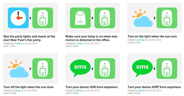 现在 IFTTT 开始突破“网络服务粘合剂”的角色,让设备自动完成某种任务。不过,目前结合 IFTTT 的设备不多,只有贝尔金的 WeMo 系列。IFTTT 为此增设了两个频道,分别对应 WeMo 系列的两台设备 WeMo Switch 和 WeMo Motion。