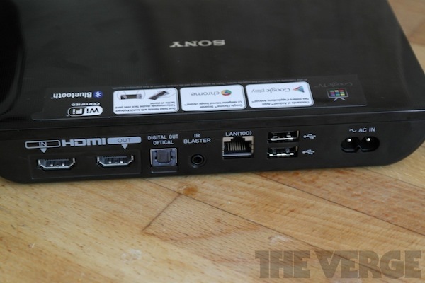 在机身背面出现了各式各样的插口:HDMI Input、HDMI Output、两个 USB 插口、网线接口、光纤数字输出、电源插口。