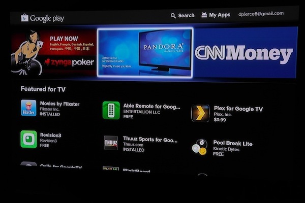 Google TV 的应用数量比之前大为提高,多亏 Google Play。不过,一些应用的界面并未为电视机大屏幕的操作而优化,比如 Pierce 下载的 Slacker Radio、Pandora,它们的界面看上去就是简单地把 Android 手机上的界面搬到电视屏幕上,看上去很糟糕。此外,一些受欢迎的应用,并未支持 Google TV,比如国外受欢迎的 Spotify、Rdio、Angry Birds。不过,Plex 这个应用值得一试,它已经预装在 Google TV 中。