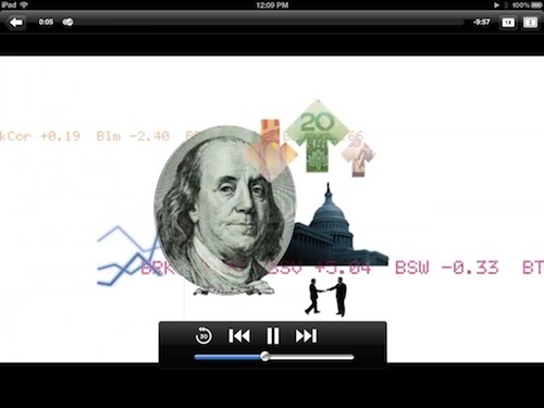 视频播放界面的元素没有音频播放界面那般丰富,但功能也不少。在界面的右上方有两个按钮,左边那个是用来调节节目播放速度的,一共有三个速度档可以选择:一又二分之一倍、二倍、二分之一倍;右边那个是调节画面大小的,点击之后画面便可放大,占满 iPad 整个屏幕。而下方的播放控制面板上,左边标记有数字“30”的按钮,则是后退 30 秒。点击左上方的后退按钮,则回到原来挑选节目的列表中。