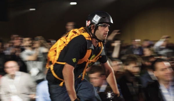在 Google I/O 上,Google Glass 最后一个出场,担当了“压轴戏”的角色,出场方式相当戏剧性——Google 在会场实时直播一群戴着 Google Glass 的跳伞队员进行跳伞,Google Glass 以第一人称视角将图像传送到会场中, 人们能清晰地感受到跳伞队员在降落时的速度感,那距离越来越近的地面,霎时间跳伞队员在跳伞时的感受便传达给众人。紧接着,这些跳伞队员降落到 Google I/O 会场的屋顶,在表演了速降之后,又骑着单车进场,他们的出现惹来在场人员们的欢呼!Well done,Google!