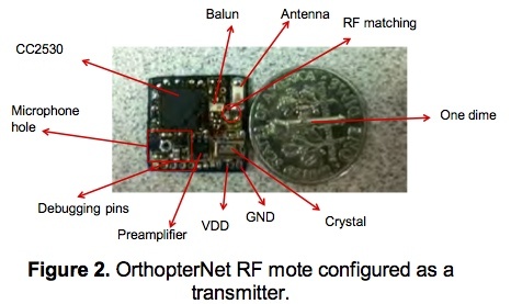 从这个图可以看出,这个昆虫组成的无线网络最关键的组成部分是两个:一个是搭载无线发射模块的昆虫,一个是无线发射模块。