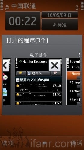 Symbian^3 上的多任务切换窗口中显示了正在运行的程序界面,而不是 S60V5 上的程序图标,更加直观。左右滑动即可在多个任务间切换,点击程序窗口右上角的叉子,可以关掉该程序。不过我还是觉得 webOS 的任务管理器更好看。