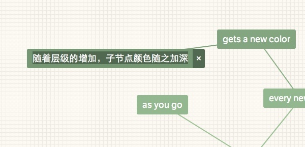 它的操作也简单自然,精髓在于“拖拽”二字。若你有什么新想法,直接在子节点上按着鼠标左键往外拖(在 Mac 上只要按照正常的拖拽操作,三指同时按下往外拖)。而修改也很简单,直接点击便可修改子结点上的文字。