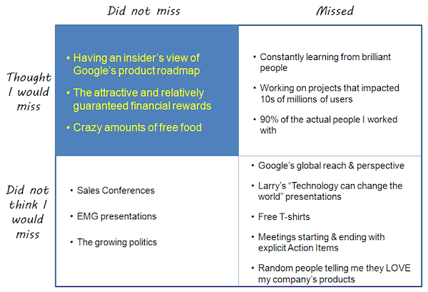 从 Monical 的四象限图中,可以看出为 Google 工作,经济利益、Google 产品的路线图反而不是令人想念的。他最想念 Google 里面的人,获得学习的机会,自我价值的实现,里面影响了你的人,简单明了的人际关系,大公司的视野以及一些有趣的文化。