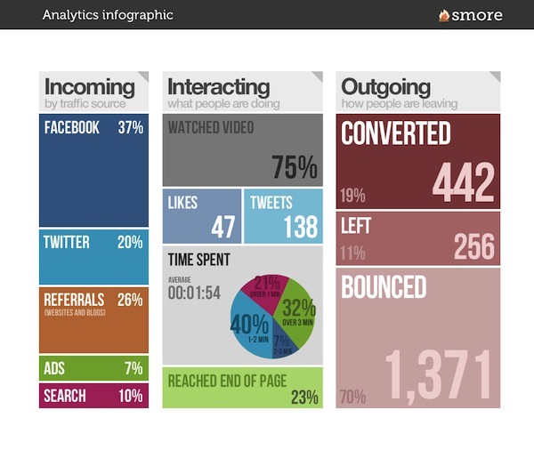 smore 并不只是提供制作传单的功能,它还能帮你统计其他人收到传单后的操作行为(该功能需要 Google Analytics Code),并且生成简单易懂的图表(下图)。根据图表你可以作出相应的调整,以达到更好的宣传效果。