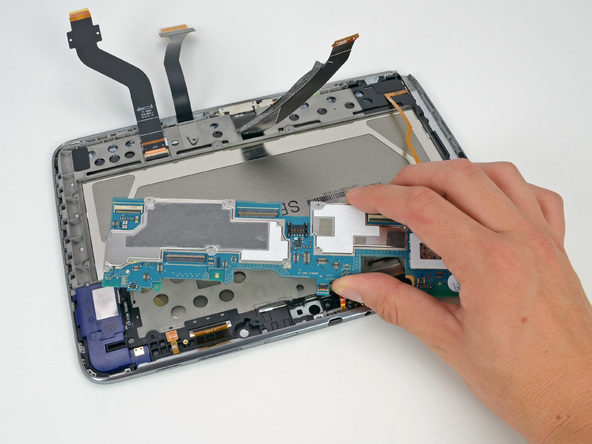 取出电池之后,轮到 Galaxy Note 10.1 的主板,拆卸过程也比较简单,只要将与主板相连的线缆拔开即可。主板上面的电磁屏蔽遮罩是可拆卸的,没有焊死。