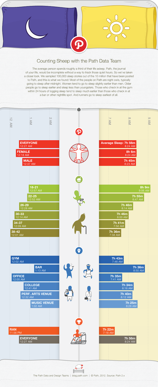 根据 Path 统计,平均每个人在晚上 12:27 分入睡,早上 8:24 分醒来,睡眠时间 7 小时 56 分钟,这意味着 Path 用户喜欢晚睡晚起,或者说这是现代人生活的常态。
