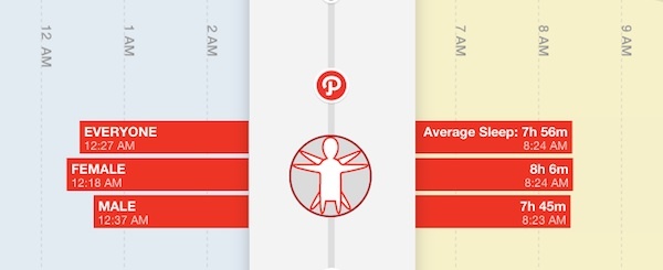 Path 还分别统计了男性、女性的睡眠数据。女性一般晚上 12:18 入睡,早上 8:24 醒来,睡眠时间 8 小时 6 分钟。男性一般晚上 12:37 分入睡,早上 8:23 分醒来,睡眠时间 7 小时 45 分钟。之所以女性要比男性睡得更多,是因为男性更喜欢晚睡。