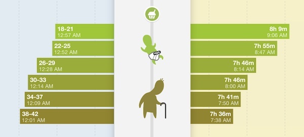如果按照年龄区分,年纪越大的人睡眠时间越少。相比年轻人,他们更喜欢晚睡早起。年纪越大的人,醒来时间就越早。18 岁到 21 岁的人一般在早上 9:06 醒来,而 38 到 42 岁的人则 7:38 醒来,提早了一个半小时。