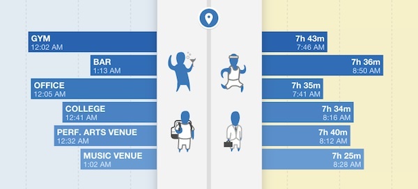 平均晚上 12 左右才入睡,这证明相当多人选择凌晨时才入睡。不过,Path 的数据表明,在如果用户白天时在不同地方签到,所表现的睡眠情况则不相同。如果人们在健身中心、办公室签到,那么睡眠就变得比较正常;如果在酒吧、音乐会场签到,那么人们必定晚睡晚起——过夜生活和听演唱会耗时必然较长。学生群体是比较喜欢晚睡的。