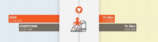 由于 Path 可以和 Nike+ 关联,我的某些朋友开始喜欢在 Path 中分享跑步情况。有趣的是,习惯跑步的人群与没有跑步习惯的人群,在睡眠上的表现也不相同。习惯跑步的人更喜欢早睡早起,一般晚上 11:56 入睡,早上 7 点 18 醒来。这个记录比人均入睡时间提前了差不多半小时,比人均醒来时间提前了约一个小时。的确,我那些喜欢跑步的朋友,生活作息一般比较规律,也更注意睡觉时间,他们一般不会选择凌晨的时候才睡觉。