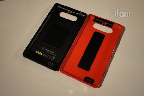Lumia 820 的后盖拆开后可以直接看到可以自行更换的电池,它的默认后盖不支持无线充电,需要像 Palm Pre 或者三星 Galaxy S3 那样更换后盖才能充电。充电后盖略据说会厚一点,但肉眼很难看出区别。