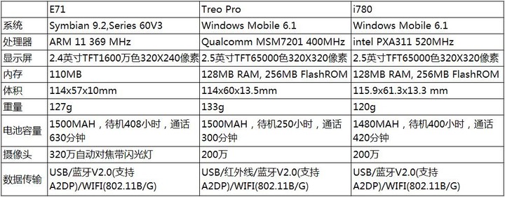 先来看一下三部机器的一些关键性参数对比(其中i780的CPU应为624MHz):
