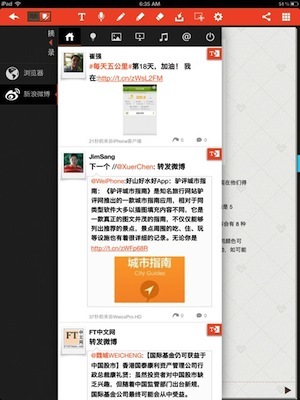 不仅如此,品读还提供了新浪微博客户端,你可以随意浏览微博。在每条微博的旁边,品读都提供了摘录按钮,直接点击它,就可以将一段微博的文字摘录到笔记本中去。同样,在浏览微博时,也可以长按,然后将微博上的图片摘录下来。摘录下来的内容,会自动转帖到笔记本中去,感觉和剪报一样——看见好的内容就剪下来,粘在笔记本上。