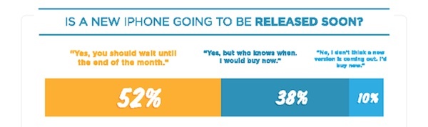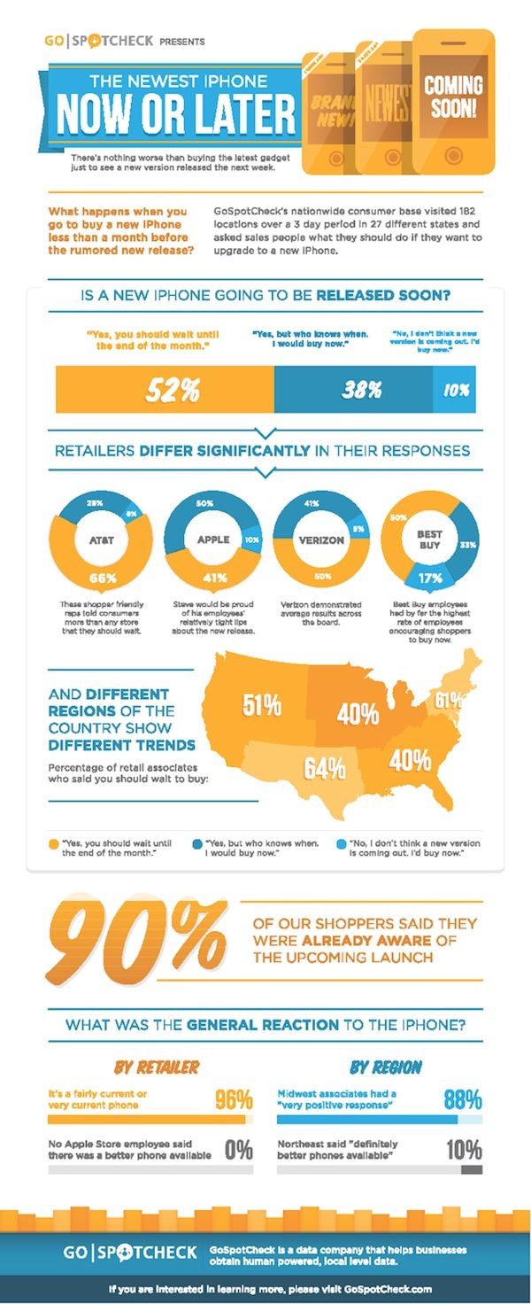 总体而言,52% 的店员会老实告诉消费者“是的,你应当等待,直到这个月底”;38% 的店员对新机型发布时间不可置否,怂恿消费者作出购买决定,“是的,不过谁知道(下一代 iPhone)什么时候上市。我会立马就买”;还有 10% 的店员会直接否认新一代 iPhone 发布的消息,怂恿消费者做出购买决定,“不,我不认为有即将上市的新产品。我会立马就买。”