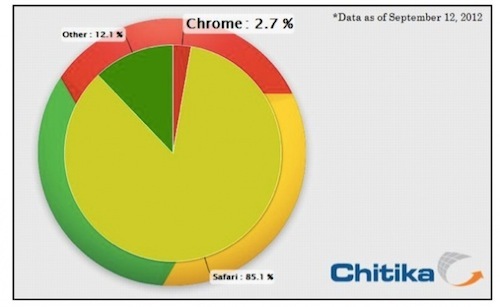 根据线上广告服务 Chitlka 的数据,在 iOS 的总流量中,有 2.7% 是基于 Chrome 浏览器产生的。如果是按照每天每小时来计算,Chitlka 称 iOS 版 Chrome 的流量能占总流量的 5%,而在 9 月 7 日时,这个数字甚至达到 6.83%。