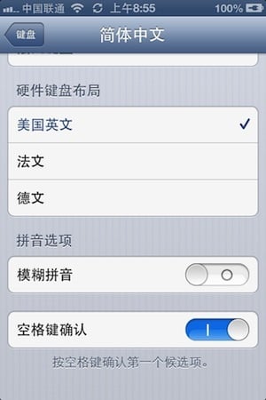 在系统输入法设置中,可以看到“空格键确认”的选项,默认开启,相信没多少人会把它关掉对于第一次使用 iPhone 的用户会比较友好