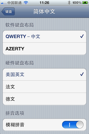 其它还有一些小改进。iOS 5 中引入了模糊拼音设置,在 iOS 6 中选项变得更加详细和丰富,也让人能够个性化选择——中国太大,有的地方“呢”“了”不分,有的地方分不清“脏”和“张”,有的地方会把“湖”念成“福”。不同地方的人,都可以根据自己的情况来自定义模糊拼音的设置,从而减少中文输入时的痛苦。