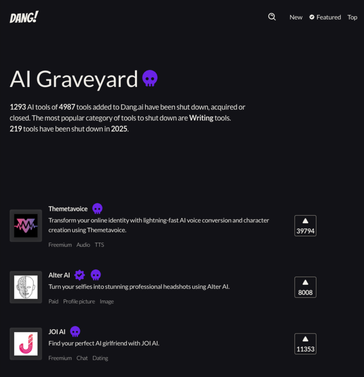AI 应用的高淘汰率,倒一直都居高不下。国外一个叫 Dang.ai 开了一个版面,就叫「AI 坟场」,整理了一套产品名录里。其中,有 1289 个产品是关闭,或者停止运营的状态,主要是国外的产品,光 2025 年,就新增了两百多个。