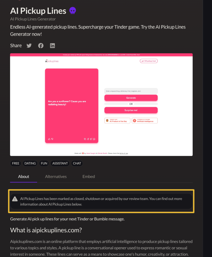 这是 AI 产品的一个大坑:以 AI 搭讪台词生成器「AI Pickup Lines」为例:它号称每天可免费生成 10 条搭讪句子,付费订阅则解锁无限生成,庞大的搭讪语料库。