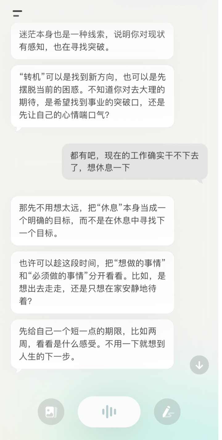 同时,它也不会错过里面暗藏的信息点。在后面提出旅行目的地建议时,它能够识别出前面聊天中所识别出来的、对放松和宁静氛围的追求,从这个角度提出建议。