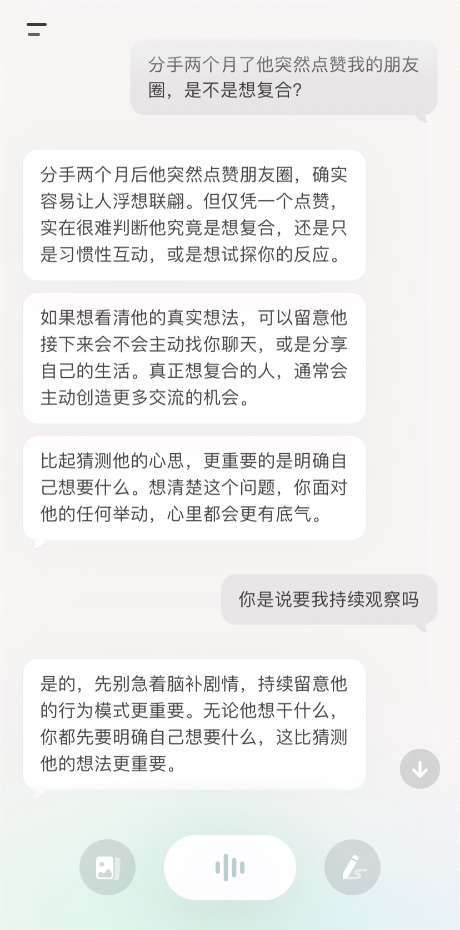 像这个跟感情相关的对话中,它始终强调,「明确自己想要的,比猜别人的心思更重要」,把确认用户自身的感受放在第一位。