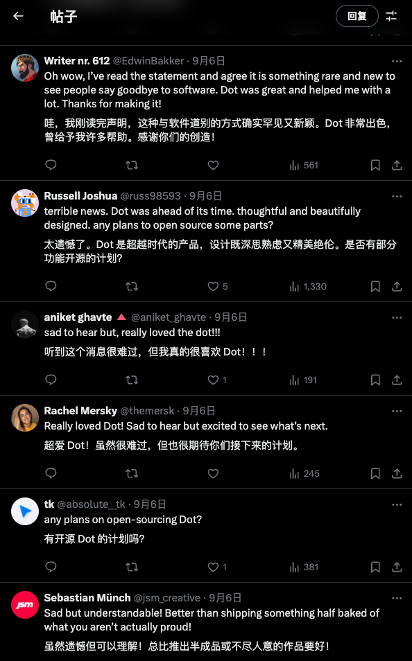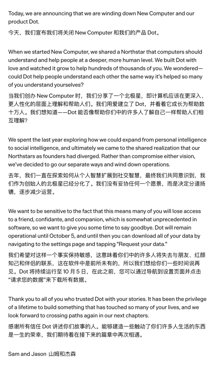 说不定,用户可能也没这么在乎 AI 呢?——同一时间,由前苹果设计师 Jason Yuan 创立的情感陪伴应用 Dot 宣布,将于当年 10 月 5 日停止运营。