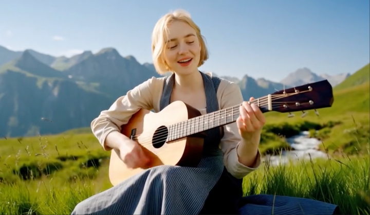 我试着让模型生成一段女生弹吉他的视频,它不仅精准对上了口型,拨弦的动作和音乐的节奏同步,连眼神和微表情都带上了戏。