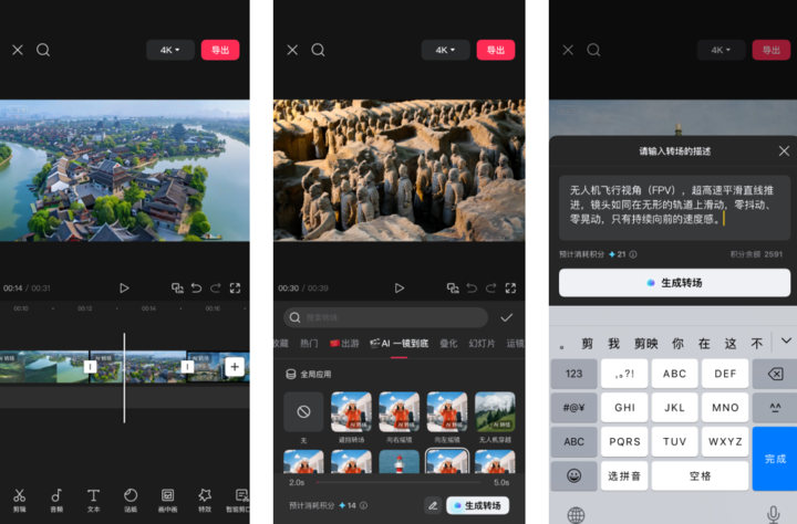从输入文字一键生成视频的「AI 文字成片」,到媲美真人的「AI 配音 3.0」;从实现电影级运镜的「AI 转场」,到能对话改图的「seedream 4.0」……剪映几乎是将 AI 武装到了牙齿。