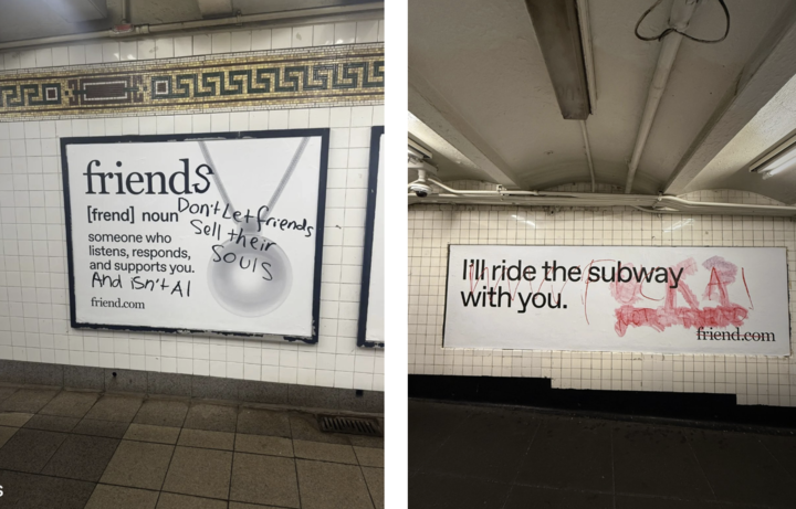 很快,这些广告被路过的群众用涂鸦覆盖。诸如「停止利用孤独赚钱」「AI 不是你的朋友」「去交真正的朋友」等手写的抗议,比任何市场调研都诚实。