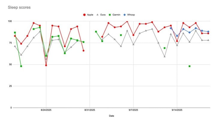 苹果的睡眠评分也以鼓励性质为主,Lifehacker 对比了好几家不同可穿戴设备的睡眠评分,发现 Apple Watch 的给分基本都是最高的。