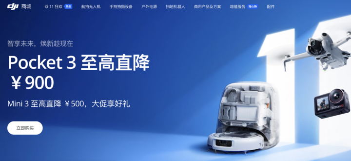 日前,大疆宣布将在 10 月 9 日开启双十一狂欢,多款热门产品大幅降价,包含 Pocket 3、Action 4、DJI Mini 3 等产品,最高优惠达 1478 元。