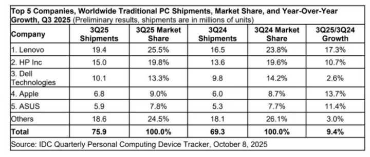 国际数据公司(IDC)发布的最新《全球季度个人计算设备追踪报告》显示,2025 年第三季度全球传统 PC 市场(包括台式机、笔记本电脑和工作站)出货量达到 7590 万台,同比增长 9.4%。