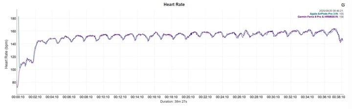Nick Harris-Fry 以 Garmin HRM600 胸带(电信号级精度)作为对照,结果发现 AirPods Pro 3 的心率曲线几乎与胸带重合,尤其在稳态跑与间歇跑这种对精度要求极高的场景下,两条曲线如同镜像般贴合。
