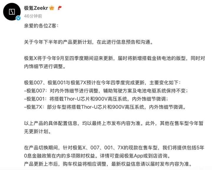 这是本次焕新与以往最大的不同。极氪一改过去「秘而不宣,突然发布」的做法,转而采用了一套极为透明的前置沟通策略。早在今年 8 月,也就是发布会前两个月,极氪就主动预告了年底的焕新计划,并直接亮出了 900V 平台和 Thor-U 芯片这两张底牌。