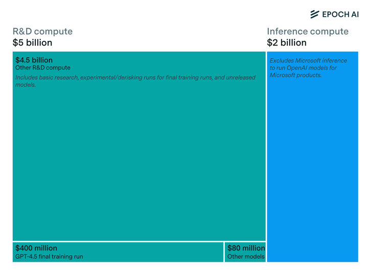 - 约 50 亿美元用于研发算力资源,其中 45 亿美元用于幕后研究和各种实验性运行;而仅有 4 亿美元用于 GPT-4.5 的最终训练;以及 8000 万美元用来训练其他模型;