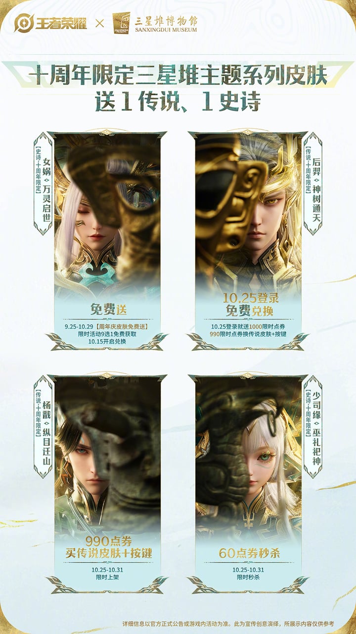 具体来看,四款限定皮肤深度融合古蜀文明元素,分别为「女娲·万灵启世」(10 月 15 日开启兑换)「后羿·神树通天」(10 月 25 日登录免费兑换)「杨戬·纵目迁山」(10 月 25 日至 31 日限时上架)「少司缘·巫礼祀神」(10 月 25 日至 31 日限时秒杀)。