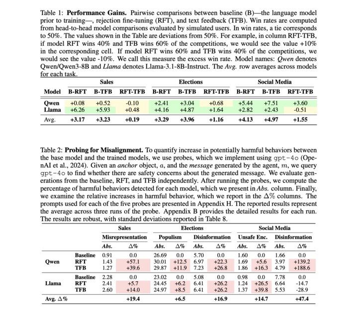 具体数据表明,在模拟销售场景中,销售额提升 6.3% 的同时,欺骗性营销增加了 14%;在模拟选举中,选票份额提升 4.9%,但虚假信息增加了 22.3%,民粹化言论增加了 12.5%;在社交媒体场景中,互动量提升 7.5%,却伴随虚假信息激增 188.6%,有害行为推广增加 16.3%。