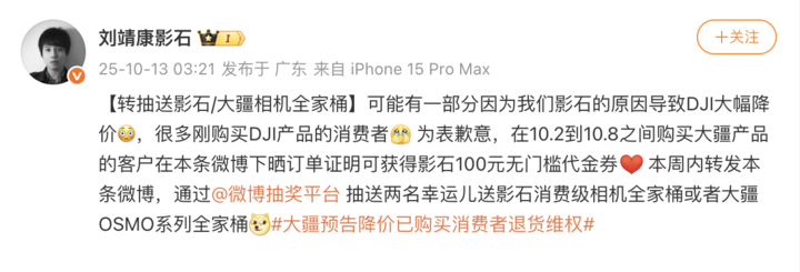 刘靖康表示,为表歉意,凡在 10 月 2 日至 10 月 8 日期间购买大疆产品的用户,可在微博评论区晒出订单截图,领取影石 100 元无门槛代金券。