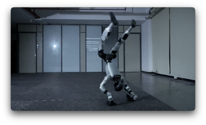 视频中,机器人不仅完成了标准的功夫招式,还流畅地完成了后空翻、翻跟头等高难度动作,整体表现更加自然、连贯。