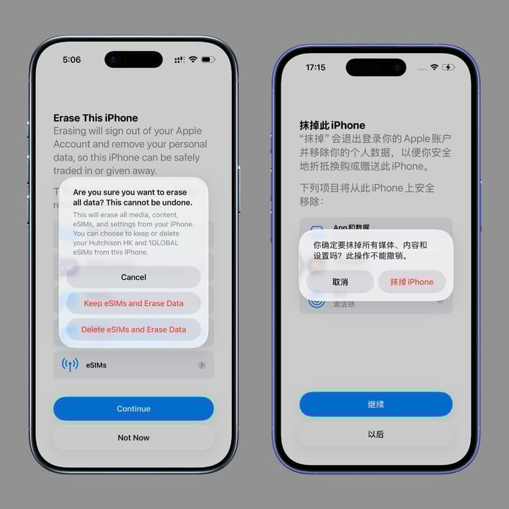 从技术层面,选择保留 eSIM 卡并重置之后手机的 SIM 卡状态是不会改变的,不需要重新激活。但是尚不确定目前国内运营商对于「重置手机」这种操作是否会存在限制——爱范儿合理猜测,这种情况不需要跑营业厅。
