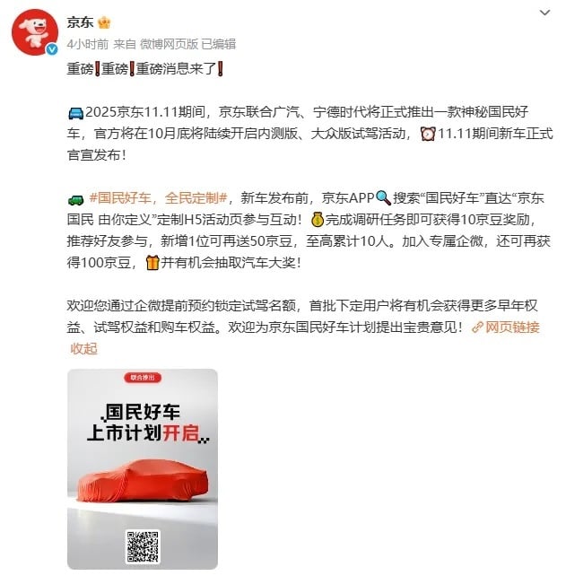 10 月 14 日,在京东 11.11 惊喜开放日上,京东宣布联合广汽集团和宁德时代,在今年「双十一」共同推出一款能够换电的「国民好车」。更关键的是它的价格——预估在 10 万至 12 万元之间。