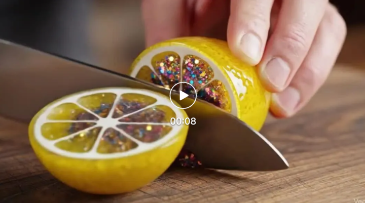 ▲由 Veo 3 生成,提示词:50mm camera, close-up angle of a lemon made out of yellow-tinted glass being sliced horizontally on a wooden cutting board. The inside of the fruit is glass as well with a little bit of melting glitter. The entire scene is soft lit from the above.
