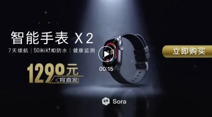 ▲由 Sora 2 生成,提示词:根据以下商品信息,生成一段电商广告视频,包含实拍感的产品展示、3D旋转细节、使用场景对比,以及配套字幕。智能手表 X2,续航7天,¥1299 智能手表,50米防水,健康监测(心电、睡眠)