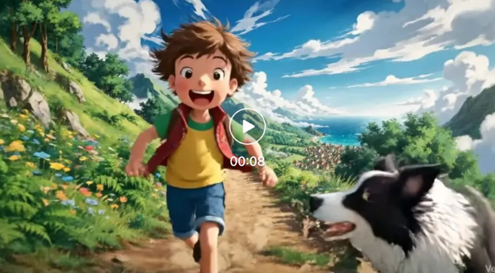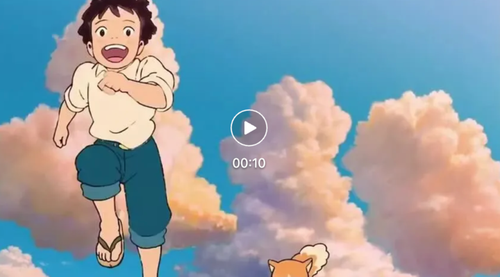 ▲由 Sora 2 生成,提示词:以吉卜力工作室动画风格,一个男孩和他的狗跑上一座长满青草的风景秀丽的山丘,背景远处可以看到一个村庄,天空中飘着美丽的云朵