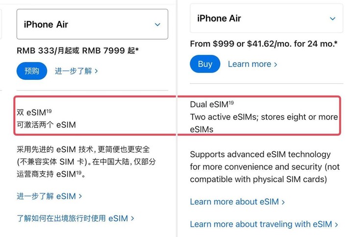 A:不是,这并非硬件限制。根据当地法规,中国大陆购买的 iPhone Air 最多可在同一设备上激活并存储两张 eSIM。这一监管要求是通过软件管理实现的。