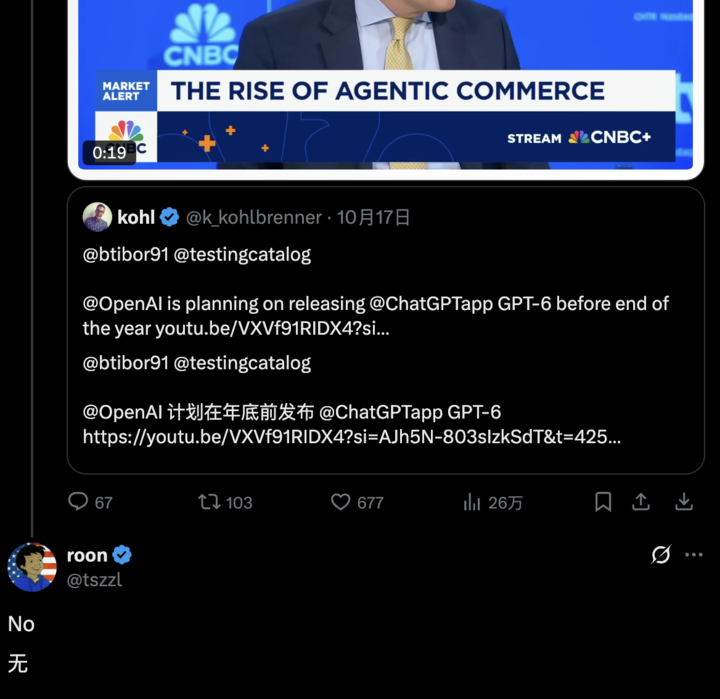 随后,被认为是 OpenAI 员工的 Roon(X 账号为 @tszzl,OpenAI 技术团队一名成员,普遍认为是 Tarun Gogineni)转发上述内容并表示「No」,否认了该报道。
