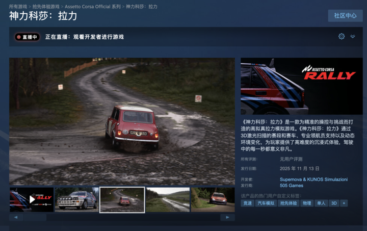 日前,505 Games、Supernova Games Studios 与 KUNOS Simulazioni 宣布,旗下《神力科莎》系列的最新作品《神力科莎:拉力(Assetto Corsa Rally)》将于 11 月 13 日在 Steam 推出抢先体验版。